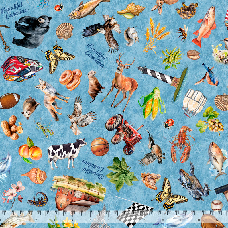 COMING SOON! The 2025 All Carolinas Shop Hop features QT Fabrics' unique collection, including a 36" x 43" panel with 30 scenes from the Carolinas in six-inch blocks, plus two extra panels showcasing North and South Carolina icons. There are also four themed prints (blossoms, camping, icons, and shells) in two colorways each, along with eight blender fabrics: four textured solids and four nature-inspired patterns (waves, trees, sand, and clouds).