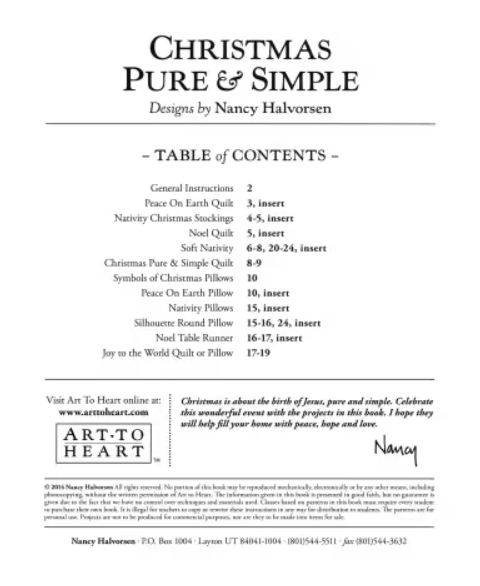Christmas is about the birth of Jesus, pure and simple. Celebrate this wonderful event with the 12 projects in this book, which include wall quilts, six Christmas stockings, a soft Nativity set, pillows and more. Table of Contents: General Instructions; Peace On Earth Quilt; Nativity Christmas Stockings; Noel Quilt; Soft Nativity; Christmas Pure and Simple Quilt; Symbols of Christmas Pillows; Peace On Earth Pillow; Nativity Pillows; Silhouette Round Pillow; Noel Table Runner; Joy to the World Quilt; Joy to the World Pillow. Includes full-sized fold-open removable templates.