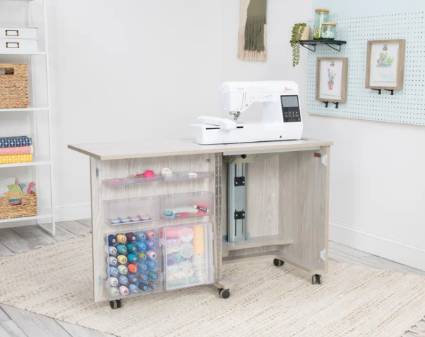 Designed for small spaces, the compact transforms from a perfect workspace into a sleek cabinet. The left leaf extension provides extra workspace when needed, while built-in thread and accessory storage shelves keep your essentials within reach. Smooth and easy to roll around, the Compact ensure effortless mobility and stability. Comes fully assembled.