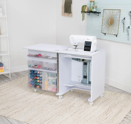 Designed for small spaces, the compact transforms from a perfect workspace into a sleek cabinet. The left leaf extension provides extra workspace when needed, while built-in thread and accessory storage shelves keep your essentials within reach. Smooth and easy to roll around, the Compact ensure effortless mobility and stability. Comes fully assembled.