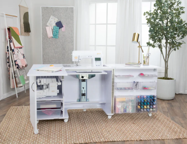 Unfold creativity with the Eclipse, designed for maximum workspace and storage. With front, back, and right leaf extensions, it expands into a spacious sewing station, complete with a built-in machine lift for ergonomic comfort. Shelves, fabric bins, and dedicated thread and accessory storage keep your supplies organized and within reach. Comes fully assembled.