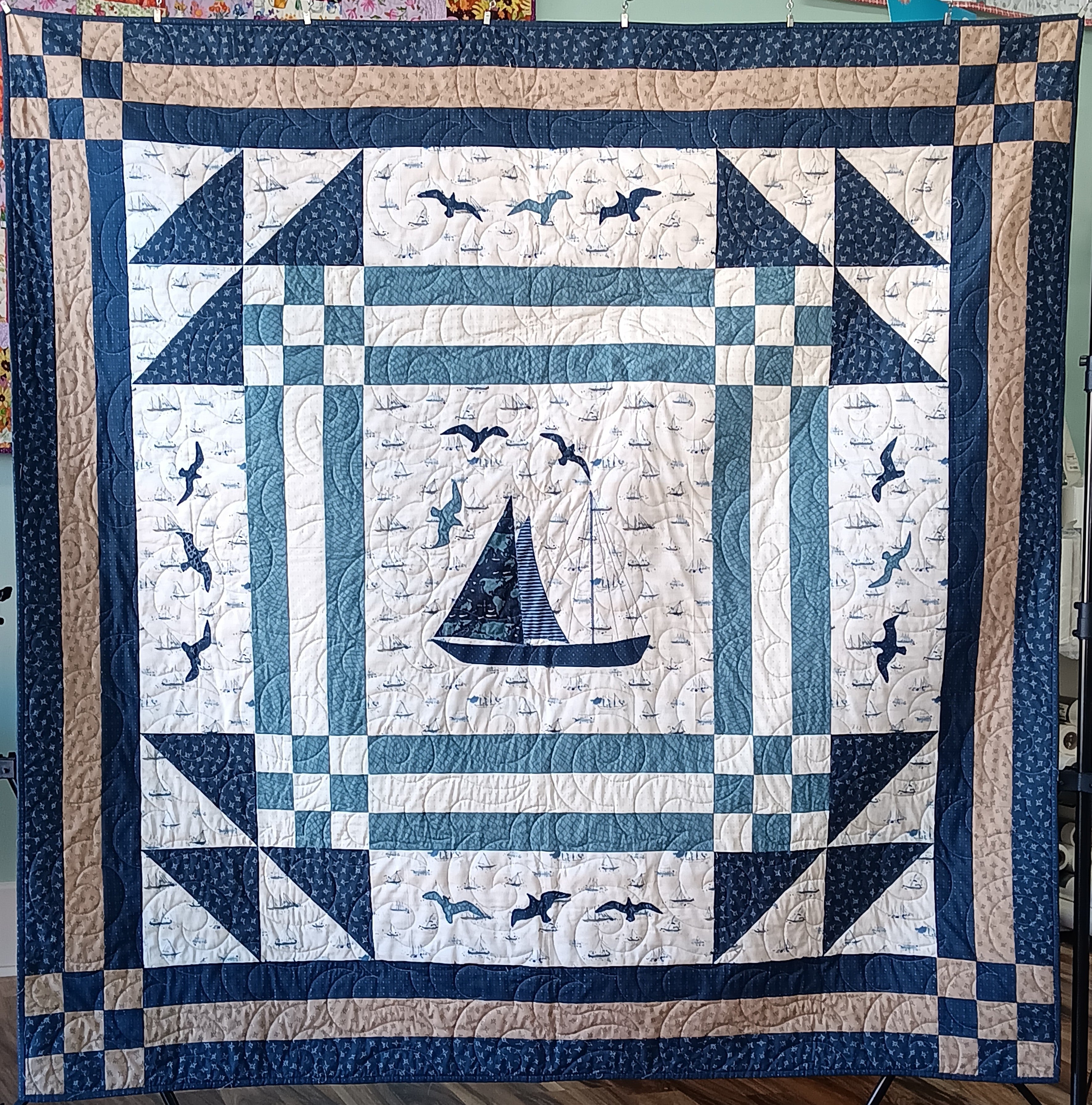 A charming nautical-themed quilt made from Longshore by Janet Clare for Moda fabrics. Designed by Janet Clare for Moda Fabrics, this project features machine piecing and appliqué in a coastal motif, finished at approximately 68" × 68". It celebrates seaside imagery like sailboats and marine elements—perfect for lovers of maritime or beach-inspired quilting.