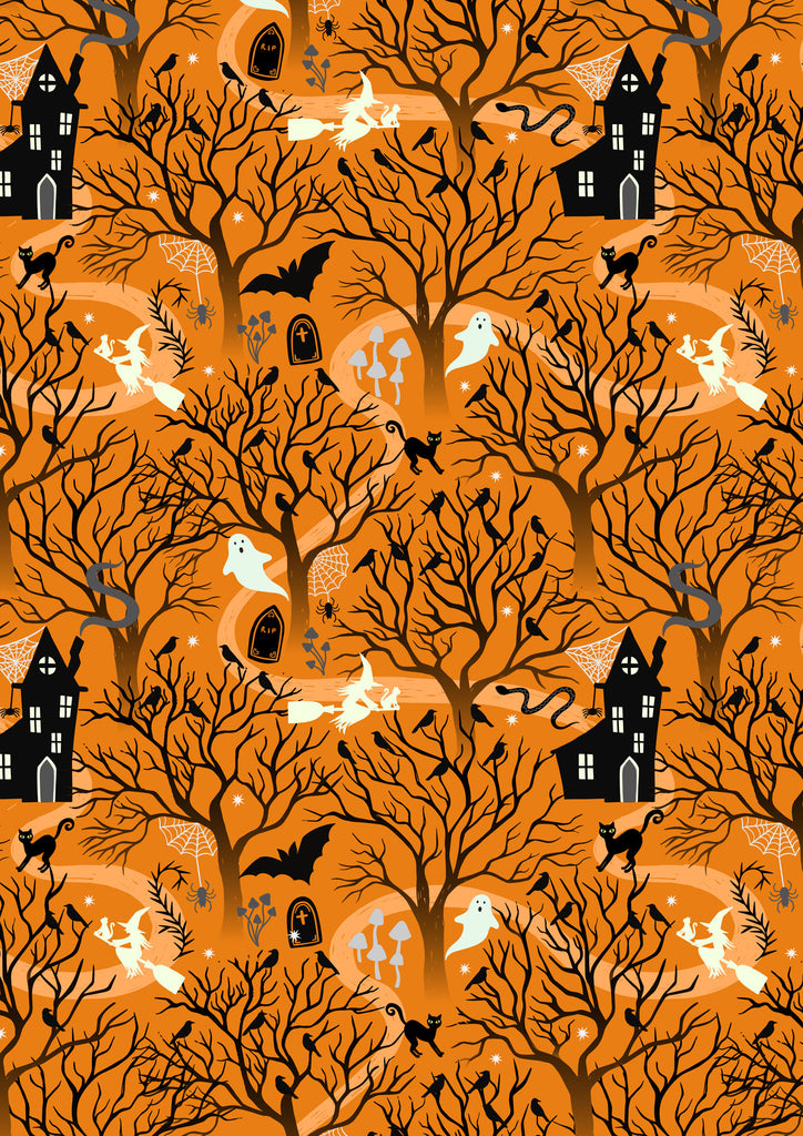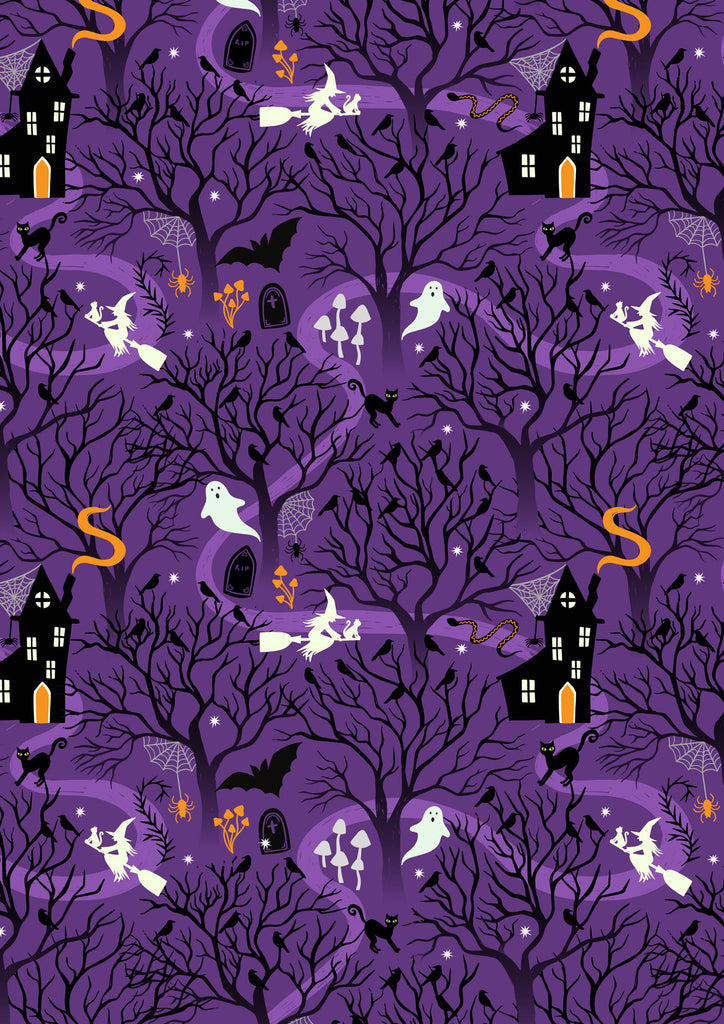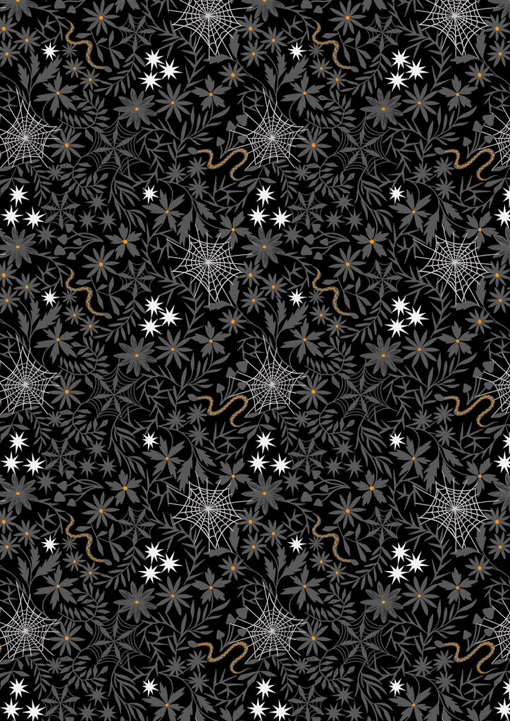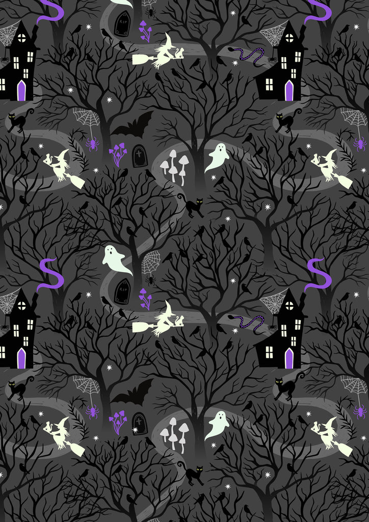 The enchantress of Witchy Woods has woven her magic into these Halloween fabrics, causing them to illuminate when the lights go out! Will you brave the journey into Witchy Woods to discover the witch’s abode? There, you’ll encounter skeletons waltzing with eerie pumpkins, curious eyes lurking among the trees, and a host of ghosts, bats, spiders, and snakes—perhaps even a witch or two! This bewitching fabric collection glows in the dark, featuring a double-edge border, Halloween bunting ready for cutting and sewing, and a glow-in-the-dark ticking stripe in festive Halloween hues!