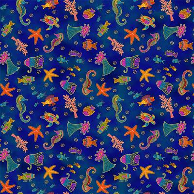 Y4703-53M, Clothworks, Designed by Laurel Burch, For Oceania Collection, Oceania Sealife, Navy Blue Gold Metallic
